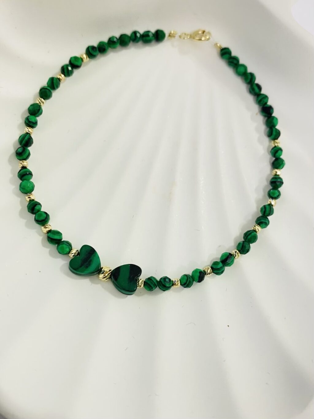 14k gold 2mm beads and one 3mm and natural 3mmmalachite natural stone and malachite hearts 18cm
