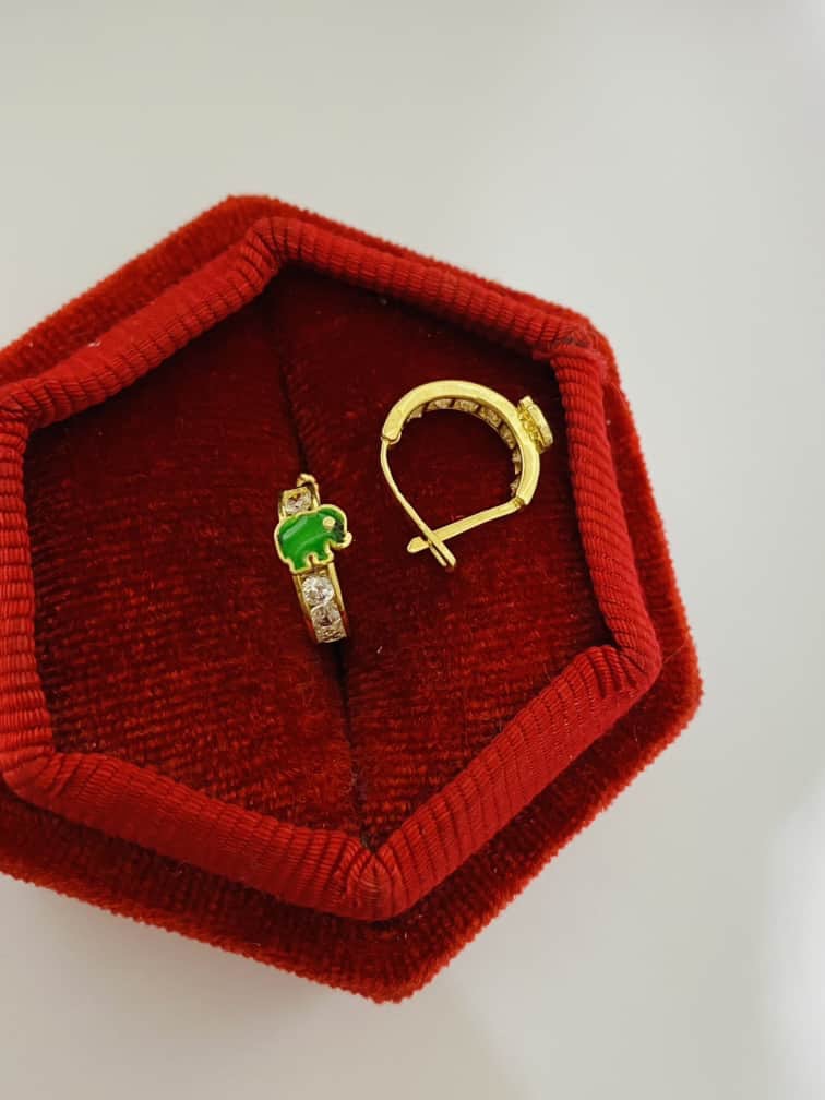 14k gold green elephant earring Janu29