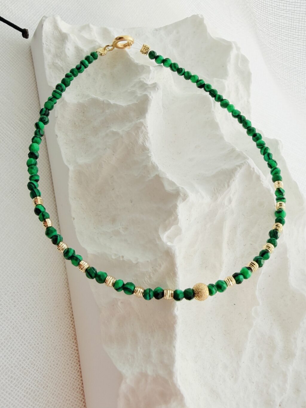 Be the first to review “14k gold 2mm and middle 3mm beads and 2mm malachite beads HM100E – 17cm”