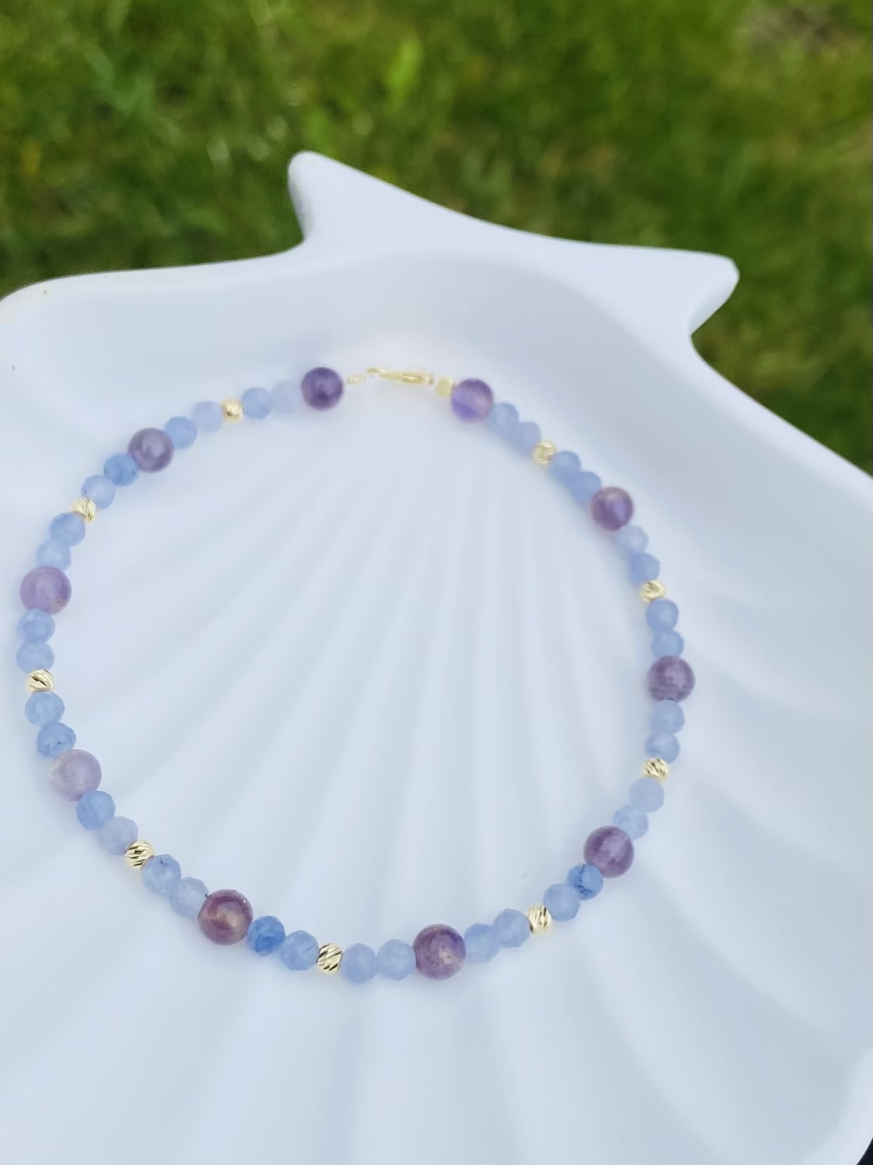 Bracelet 4mm Amethyst natural stone and 3mm Tanzanite stone and 2.5mm 14k gold beads 18.5cm